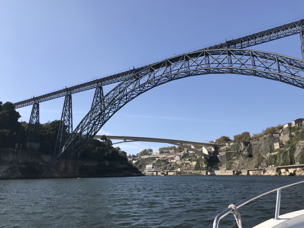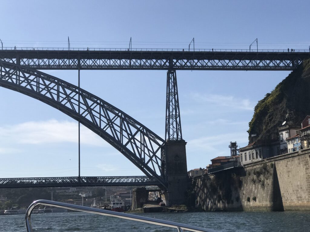 Blick vom Douro auf die Brücke, die so retro aussieht, dass man glaubt sie sei so alt wie der Herr Eifel. Da war doch was? Herr Eifel hat, bevor er in Frankreich den Eifelturm zur Weltausstellung gebaut hat, vorher geübt. In Portugal nämlich. Und da als erstes in Porto und nicht in Lissabon, wo er später wohl weiter mit seinen Konstruktionen Lifte und was weiß ich nicht alles gebaut hat. Die Brücke in Porto, die Dom Louis 1, das bekannteste Wahrzeichen, wurde von einem Schüler Eifels gebaut. Die Porto Jungs wollten nicht wie Eifel, drum stieg dieser aus und sein Schüler ein. Diese Brück ist zwar auch Ende 1886 oder so begonnen worden und heute fährt oben eine moderne Bahn.