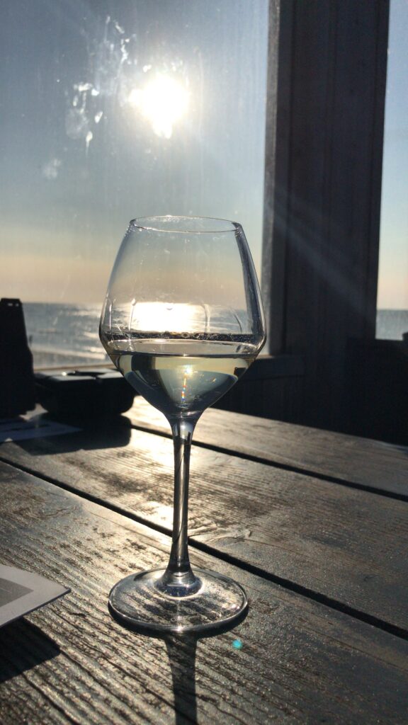 Mit Strandbude. Der Kaffee war gut. Der Kuchen ging. Und später (am nächsten Abend) durfte ich auch Wein zum Sonnenuntergang probieren. Lecker war es. Nur war es zu wenig, oder ich war zu früh da. Als der 2te Wein auf war und die olle Scheibe sich immer noch fest am Himmel krampfte, musste ich mich entscheiden: ein drittes Glas? Ich entschied mich für Bulli, und sch… auf diesen Sonnenuntergang und ging orientierungsfest zum Platz.